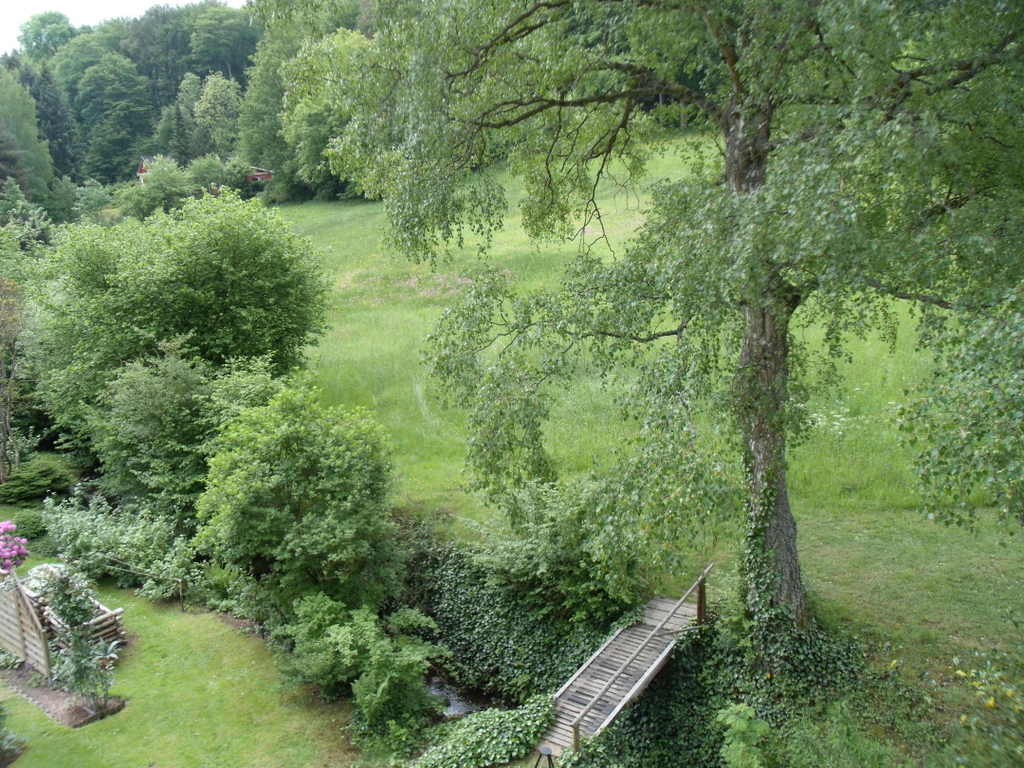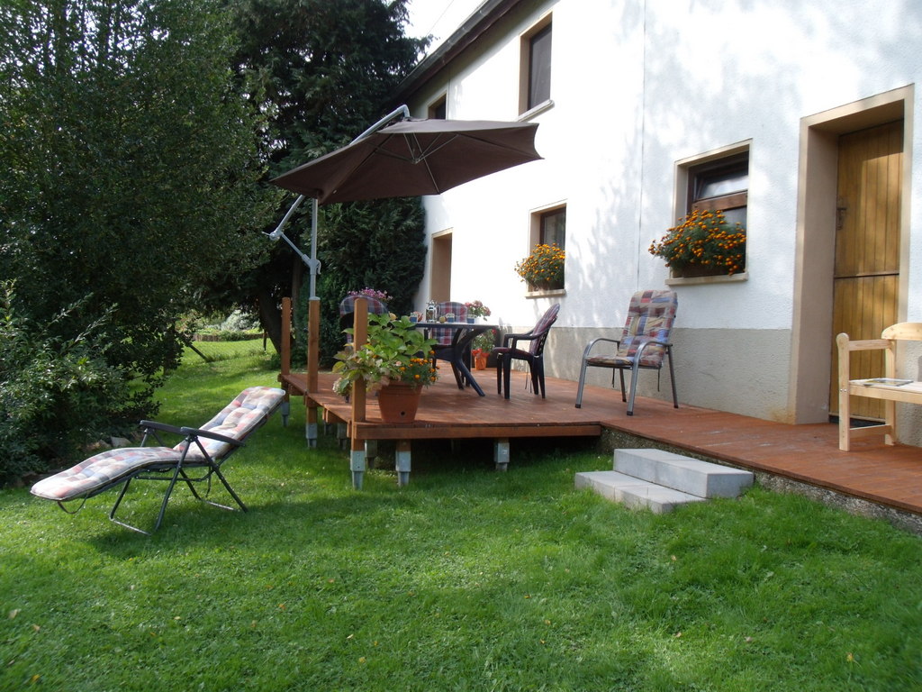 Liegewiese mit Gartenmöbeln auf der Südseite des Ferienhauses. Lauschen Sie dem Murmeln des Eichenbaches und dem Vogelgezwitscher und erfreuen Sie sich an dem wunderbaren Blick über die unberührte Wiesenlandschaft. Ein idealer Ort zum Entspannen!